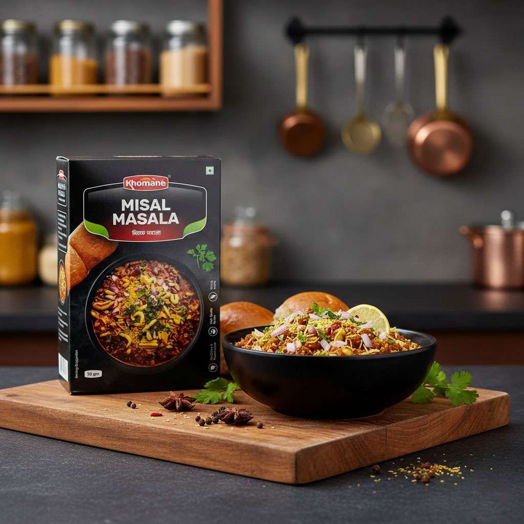 Bring the true flavor of Maharashtra to your kitchen with Khomane 100% Natural Misal Masala. Made with the finest, handpicked ingredients, this masala blend is perfect for preparing the popular Maharashtrian dish, Misal. Each packet contains a rich combination of spices, carefully selected to deliver an authentic and aromatic taste without any artificial preservatives, colors, or chemicals. Khomane Misal Masala is made with a blend of high-quality, all-natural spices sourced from trusted farmers. There are no artificial preservatives, colors, or MSG, ensuring a pure, wholesome product. A perfect balance of spices that captures the essence of traditional Misal. Ideal for making Misal, but can also be used in other Indian dishes for added flavor. Add Khomane Misal Masala to your cooked lentils (usally moth beans) with onions, tomatoes, and other ingredients, and enjoy a deliciously spicy and tangy Misal, just like you would find at a local street stall or restaurant. A healthier, natural alternative to ready-made masala blends. Indulge in the taste of Maharashtra with Khomane 100% Natural Misal Masala – because good food deserves the finest, natural ingredients.